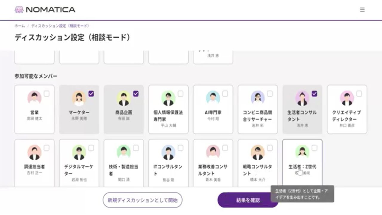営業、マーケター、デジタルマーケター、ITコンサルタント、戦略コンサルタント、商品企画、AI専門家、コンビニ商品競合リサーチャー、技術・製造担当、調達担当、業務改善コンサルタント、クリエイティブディレクター、生活者:Z世代、生活者コンサルタント、、、などの専門家(AI)がいるので、