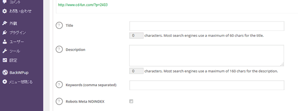 すると、ブログ入力画面の下側にAll in one SEO Packの書き込み欄が出ていると思います。